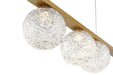 Sophisticated charm exuberates from each of the ice glass orbs that hang from a champagne gold bar. Curved on one end, the gold band adds dimension and a unique quality to this fixture. The orbs asymmetrically placed still balance out the design by strategically placing more crystal-like globes opposite the bend.