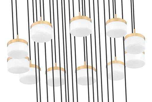 View full detailsGlimmering in brushed metal, this modern gold 27-light LED chandelier drops a constellation of frosted cloud shades that fill tall rooms with a sof...