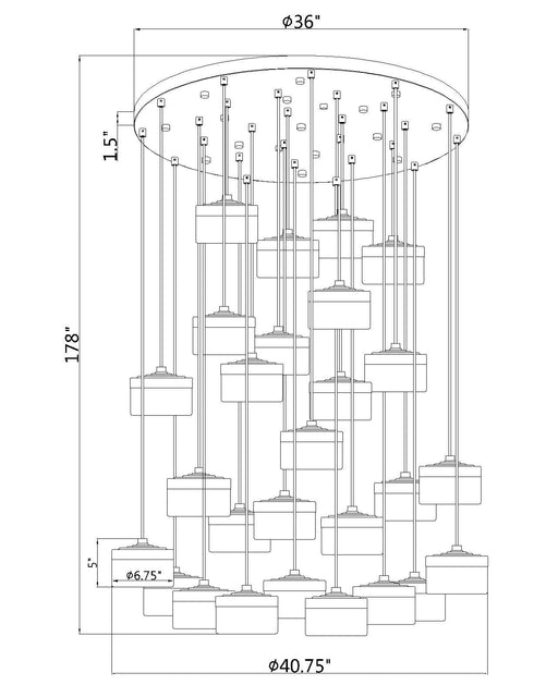 View full detailsA trio of round tiers create a waterfall effect for 27 suspended lights that make up the Alton modern chandelier. Stunning over a staircase of gran...