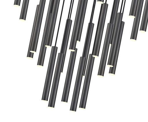 View full detailsCool matte black brings distinctive contrast and depth to this modern 27-light chandelier. Its round canopy anchors the fixture, while cylindrical ...