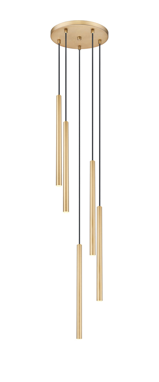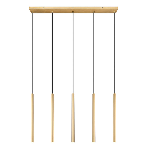 View full detailsIn a warm modern gold, this contemporary five-light chandelier sets a refined, streamlined ambiance in your entry or kitchen. Its long, slim shades...