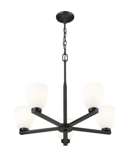 View full detailsA matte black finish adds striking contrast to the soft glow of this five-light chandelier. Ribbed matte opal glass creates dimension while keeping...