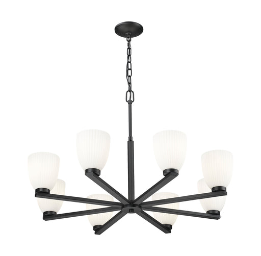 View full detailsThis eight-light chandelier pairs a dramatic matte black finish with the soft, sculptural presence of matte opal glass. Ribbed shades add depth to ...
