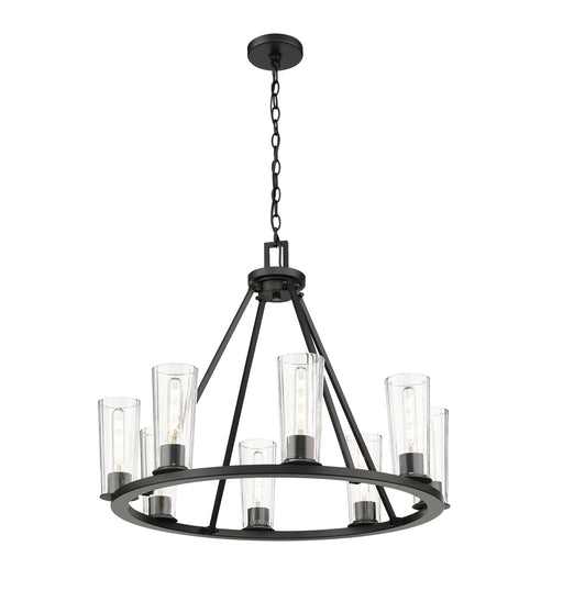View full detailsStatement-making style radiates from an industrial modern eight-light ring chandelier. Its round frame receives a matte black finish, while clear t...