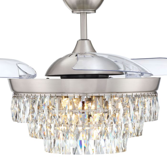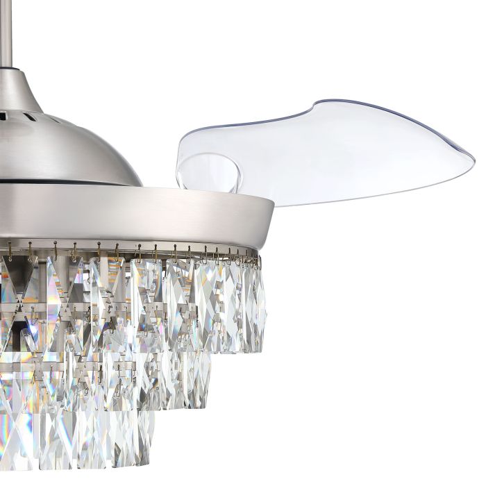 The Sofia 42" hidden blade ceiling fan features three elegant layers of faceted clear acrylic drops that surround an integrated two-tiered 6-light kit with dimmable LED bulbs included and hidden, retractable clear polycarbonate custom blades. The Sofia 42" ceiling fan combines the best features of brilliant luxury lighting with the benefits of a ceiling fan that is easily controlled with either the included remote control or the integrated WIFI for use with most smart home devices, smart phones and systems.