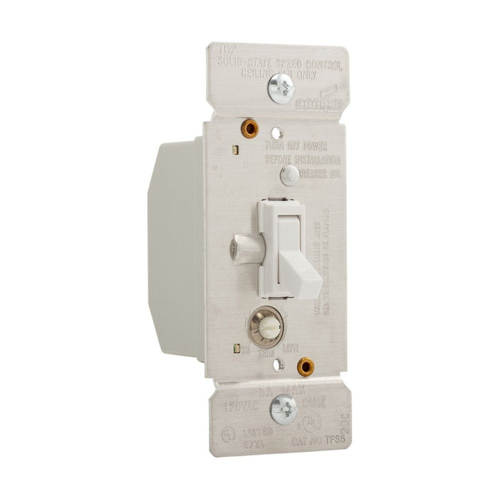 TFS5-W Eaton toggle fan speed controller, Power Failure Mode, Non-preset, 5A, Flush, 120V, Wire leads, Maintained, White, Indoor, 60 Hz, Fan, 1-pole, Single-way, 1-phase,